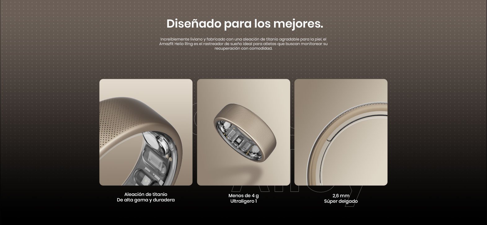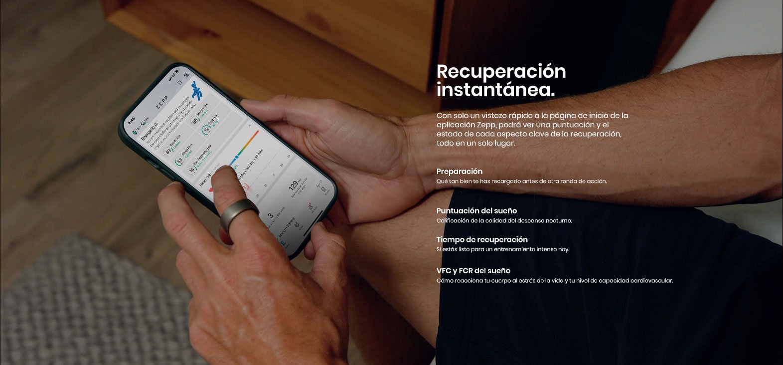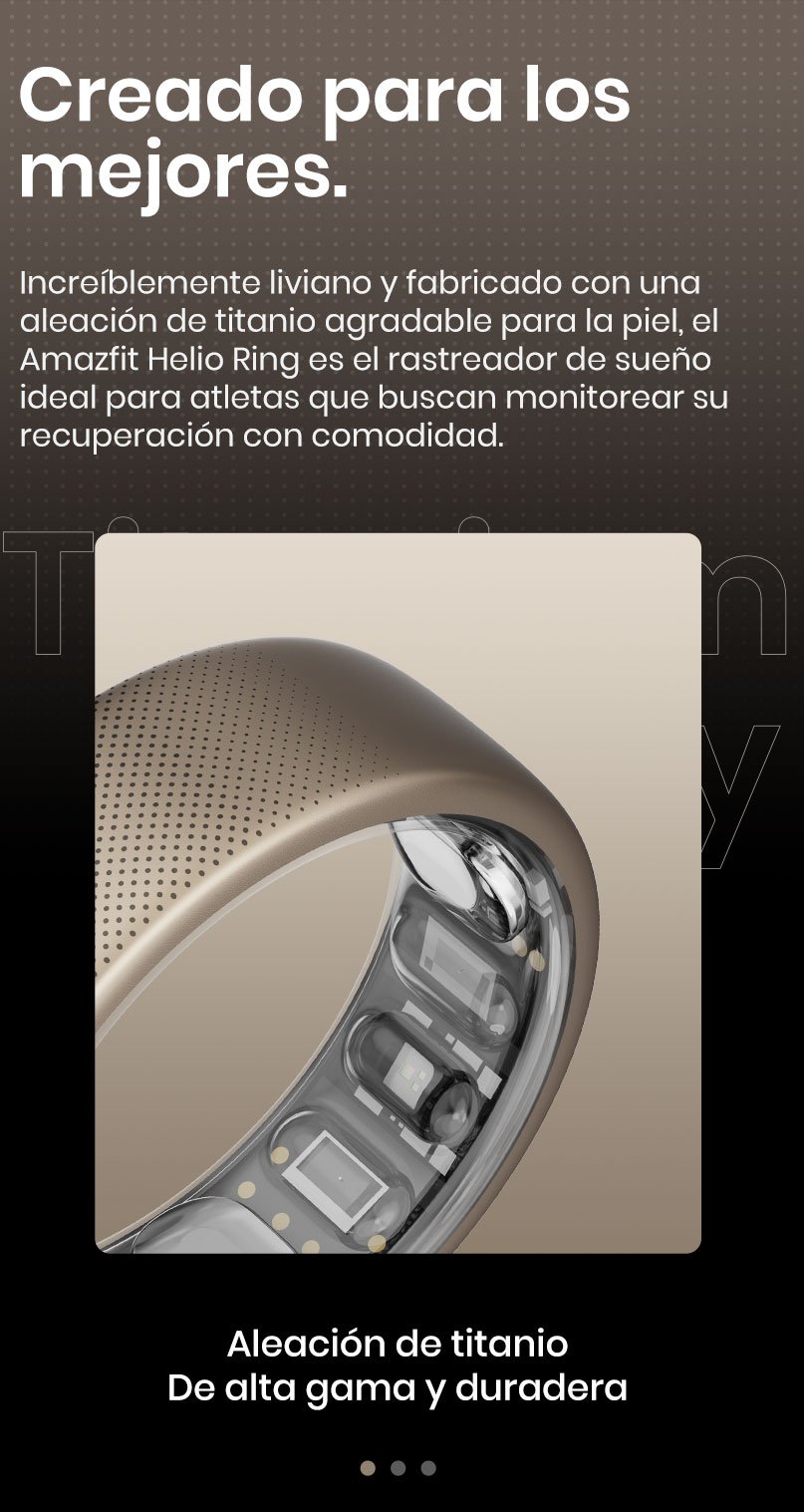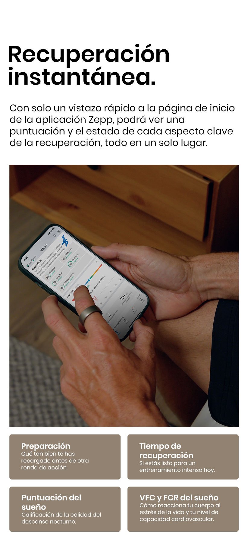 Características Destacadas Monitoreo Avanzado de Salud y Rendimiento Registra frecuencia cardíaca en reposo, HRV, carga de entrenamiento y calidad del sueño. Evalúa fatiga muscular y recuperación fisiológica. Ofrece información detallada sobre respiración y temperatura corporal. Recuperación Inteligente con Datos de Alta Precisión Fusiona información con relojes Amazfit compatibles para un análisis aún más completo. Presenta un puntaje de preparación diario basado en múltiples métricas biométricas. Sugiere tiempos de descanso y entrenamiento óptimos según tu nivel de recuperación. Diseño de Alta Gama y Máximo Confort Titanio de grado aeroespacial: Material hipoalergénico, resistente y liviano. Menos de 4 g de peso y solo 2.6 mm de grosor para una experiencia de uso imperceptible. Resistente al agua 10 ATM, ideal para natación y deportes acuáticos. Análisis Avanzado del Sueño con IA Detección de fases de sueño: Ligero, profundo y REM. Monitoreo de siestas diurnas y calidad de la respiración nocturna. Compatibilidad con Zepp Aura, un asistente de sueño con IA que ofrece sonidos personalizados y análisis detallados. Carga Rápida e Integración con Apps de Fitness Carga inalámbrica rápida en menos de 1h 40 min. Hasta 4 días de autonomía en uso estándar. Compatible con Strava, Adidas Running, Komoot, Google Fit y Apple Health. Especificaciones Técnicas Material: Aleación de titanio en el exterior y resina en el interior. Dimensiones: 8 mm de ancho y 2.6 mm de grosor. Tamaño: 10 (diámetro de 20mm Sensores: Sensor óptico BioTracke PPG para frecuencia cardíaca y SpO Sensor EDA para monitoreo del estrés y respuesta emocional. Sensor de temperatura y acelerómetro de 3 ejes. Conectividad: Bluetooth BLE, sincronización con Zepp App Resistencia al agua: 10 ATM (hasta 100 metros de profundidad).