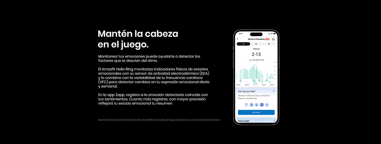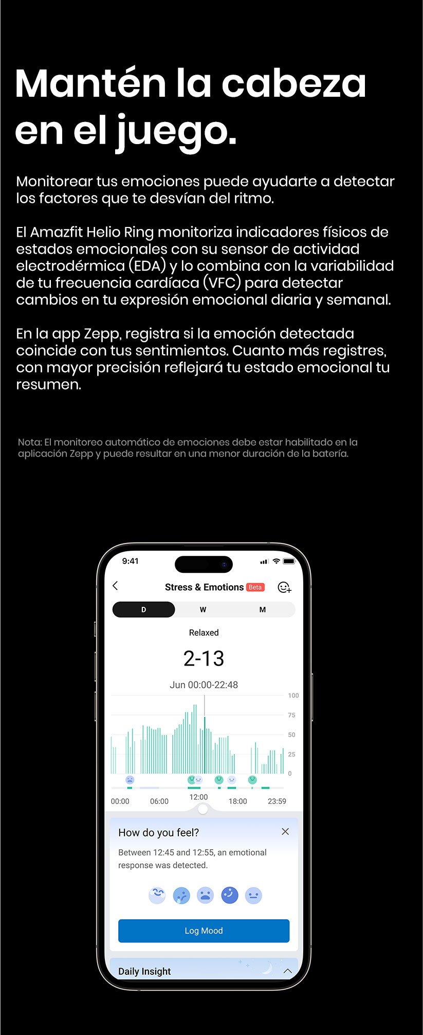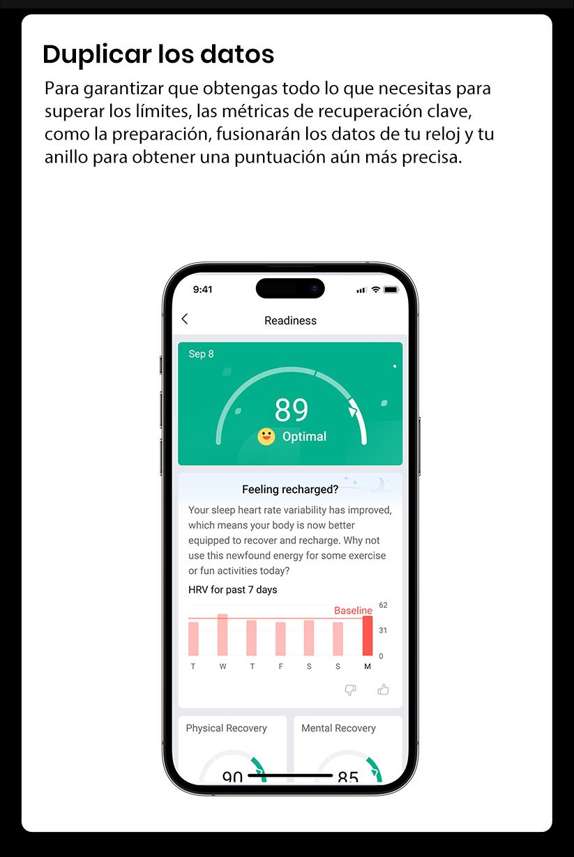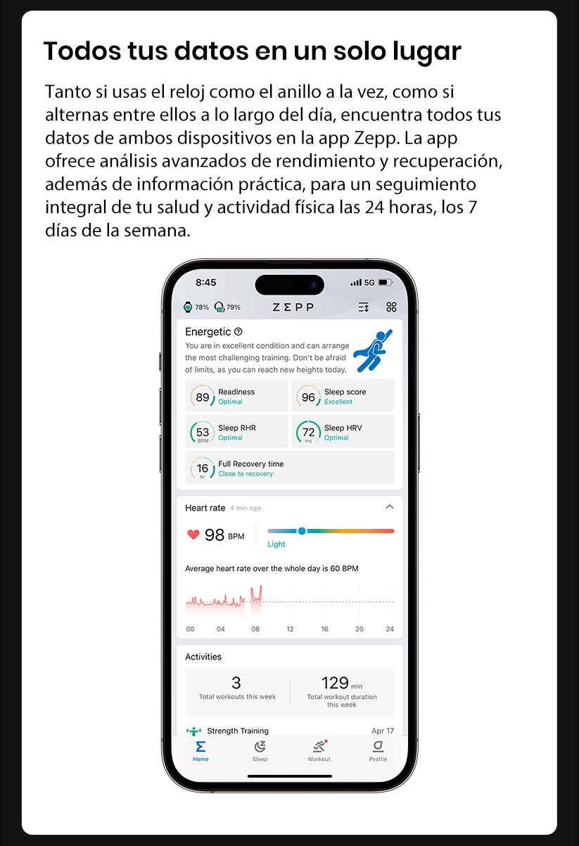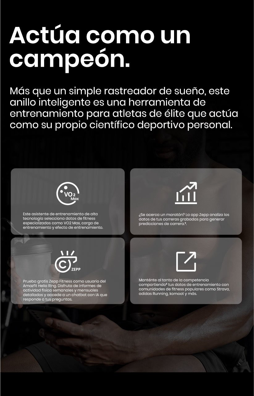 Construido con una aleación de titanio ultraligera, es resistente, cómodo y discreto, lo que lo convierte en el compañero perfecto para el entrenamiento, el descanso y la vida cotidiana. Gracias a su integración con la Zepp App, el Helio Ring proporciona análisis detallados y recomendaciones personalizadas para mejorar la recuperación y el rendimiento deportivo. Diseñado para quienes buscan superarse cada día.