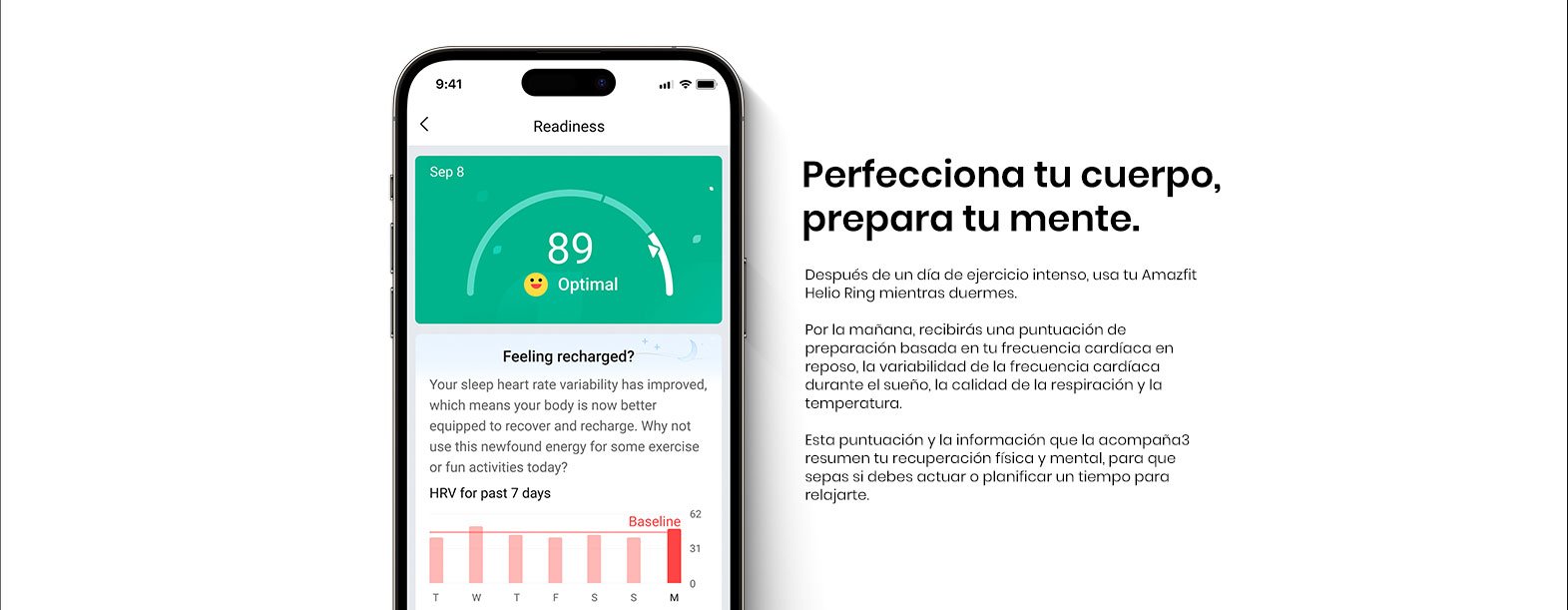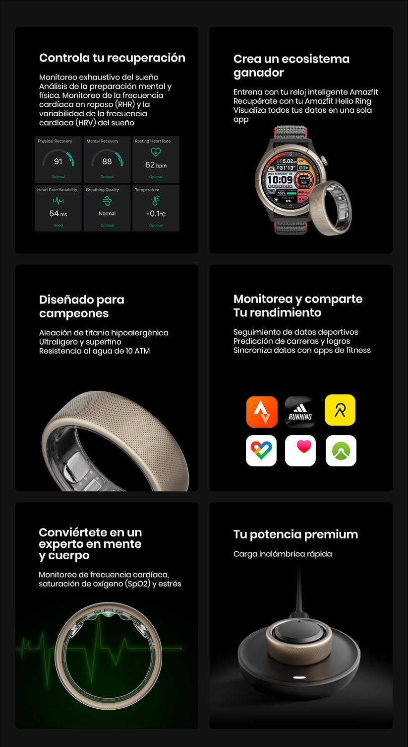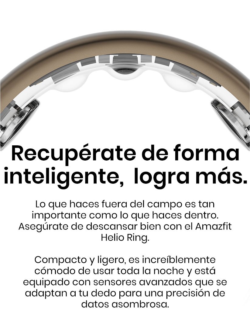 Amazfit Helio Ring – Precisión, Recuperación y Rendimiento en un Anillo Inteligente El Amazfit Helio Ring es un dispositivo innovador diseñado para atletas de alto rendimiento y entusiastas del fitness que buscan maximizar su recuperación y optimizar su desempeño físico y mental. Su tecnología avanzada permite monitorear frecuencia cardíaca, variabilidad del ritmo cardíaco (HRV), niveles de fatiga, calidad del sueño y recuperación muscular con precisión excepcional.